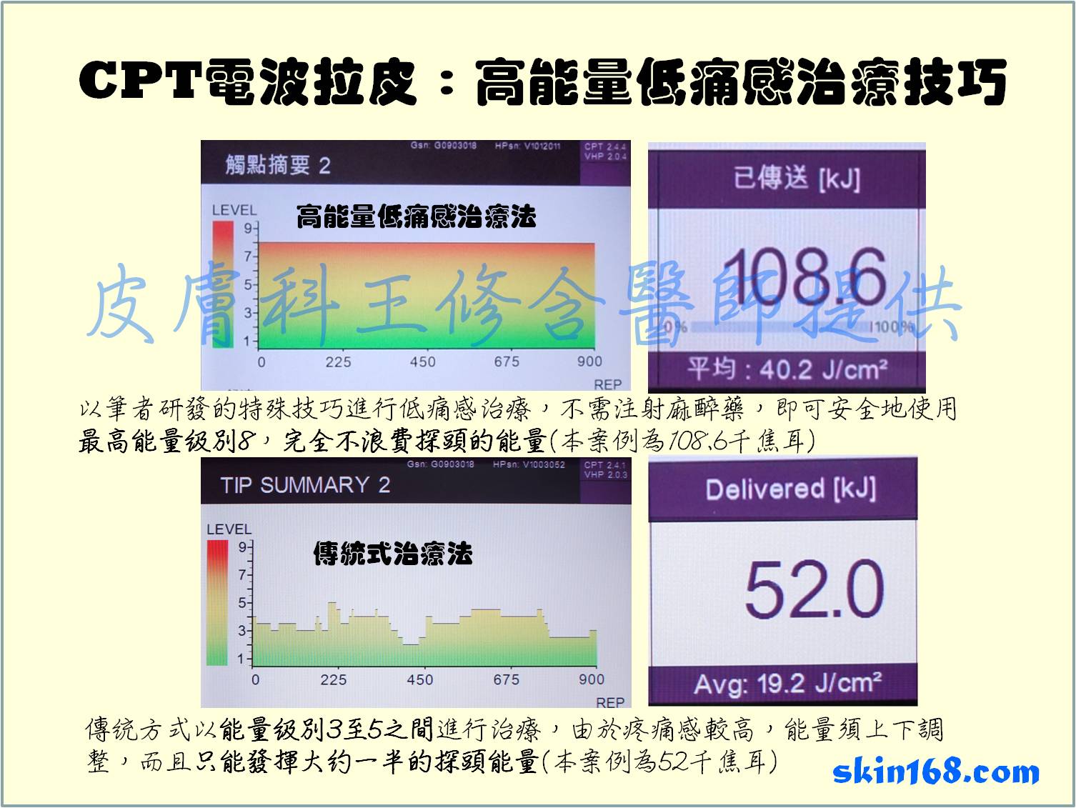 據筆者目前對於電波拉皮的治療研究經驗,新式CPT Total Tip橘色探頭(DC探頭)與CPT電波拉皮Face Tip藍色探頭相較,總能量略高而相近(如果以900發,全程打最高能量treatment level 8.0為例,CPT Total Tip的總能量最高可打到約110KJ,CPT Face Tip最高可打到約108KJ,能量通量皆約為40 J/cm2左右,略有些微差異,通常Total Tip超過此值,而Face Tip小於等於此值)。CPT Total Tip橘色探頭能量穿透較深,所以能量分布體積較大,因此對痛覺神經造成的刺激感可能較弱。若善用熱力學(thermodynamics)原理,以特殊的治療手法操作,更可能達到全程完全清醒,不使用麻醉藥物的情況下,可安全且無痛地使用8.0最高能量,完全不需要使用危險性較高的睡眠麻醉,也不需 要使用注射麻醉藥物的方式止痛。