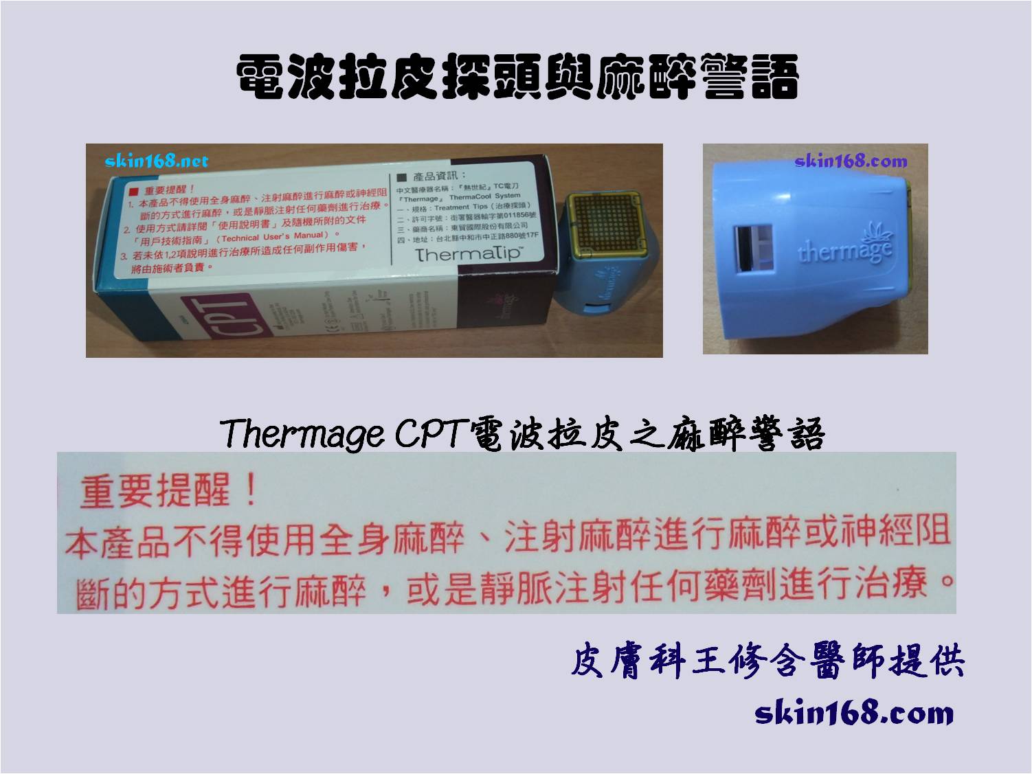| Thermage電波拉皮之麻醉警語:「本產品不得使用全身麻醉、注射麻醉進行麻醉或神經阻斷的方式進行麻醉,或是靜脈注射任何藥劑進行治療。」 |