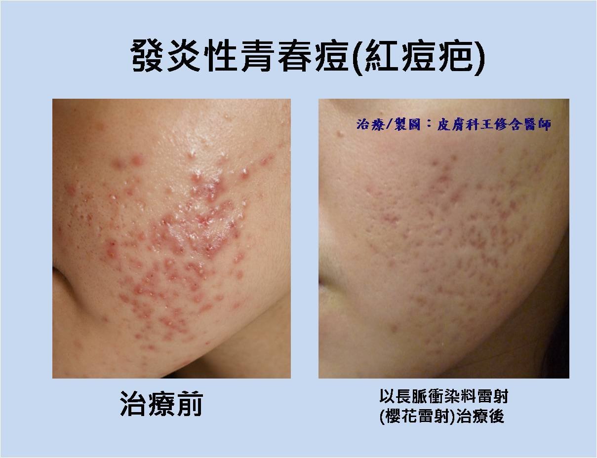 | 使用長脈衝式染料雷射(櫻花雷射)治療發炎性青春痘(紅痘疤, inflammatory acne vulgaris) |