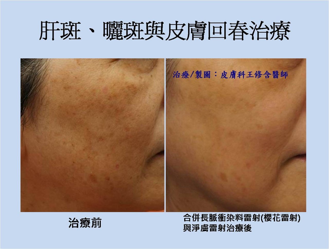 | 使用長脈衝式染料雷射(櫻花雷射)進行肝斑(chloasma)、曬斑(lentigines)與皮膚回春(skin rejuvenation)治療 |