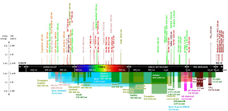 | 圖:常見的雷射種類與波長,引用自http://en.wikipedia.org/wiki/List_of_laser_types |
