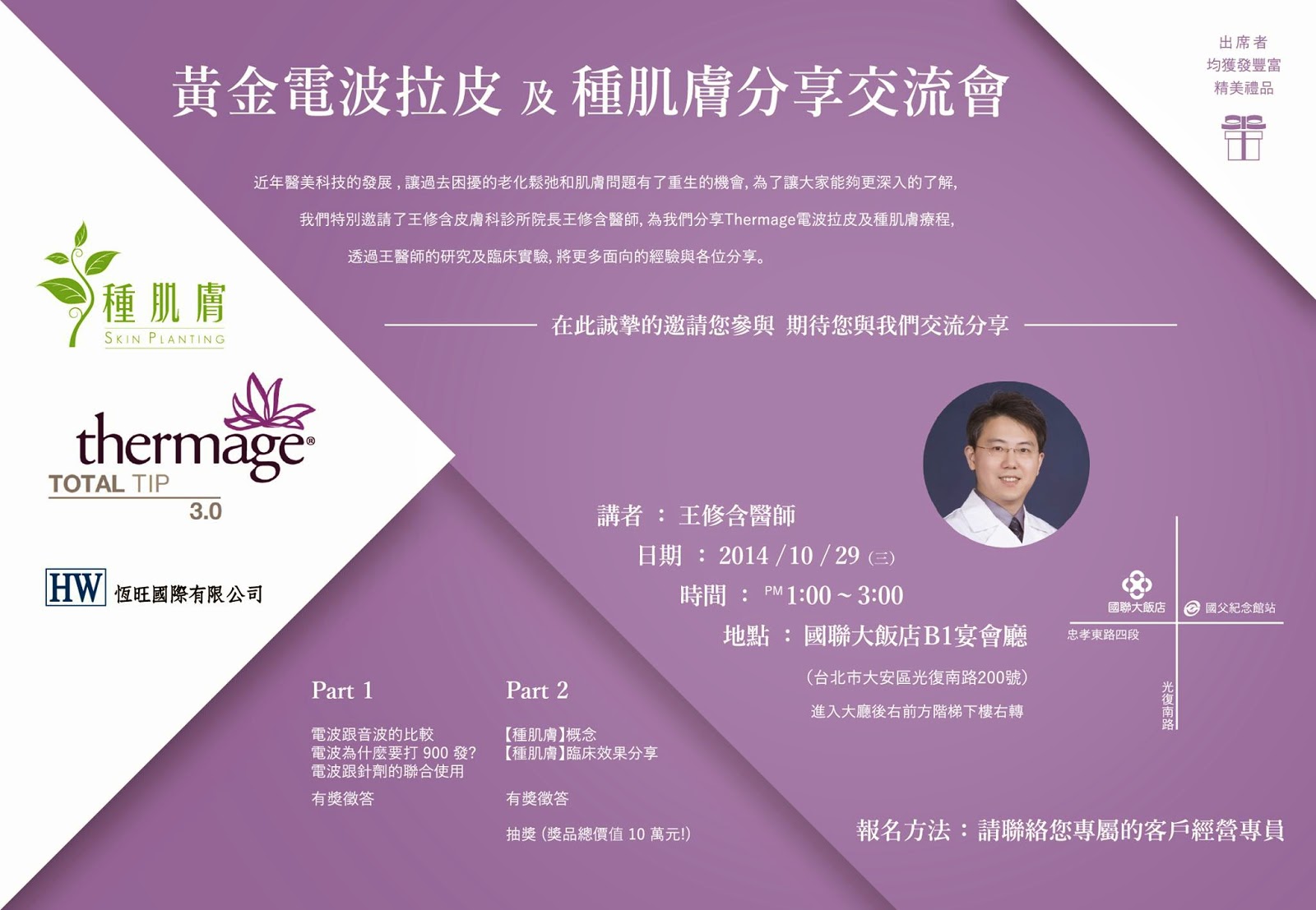 講題:1. 黃金電波拉皮 Thermage Total Tip 2. Permea 1927nm 種肌膚雷射 講師:王修含 醫師